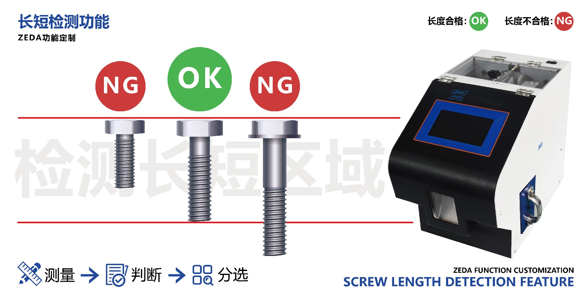 影響最終鎖附品質的(de)關鍵(jiàn)變(biàn)量。為此(cǐ),集成於(yú)供(gòng)料環節的長短檢測(Length Detection)功能——在行業中亦稱為尺寸篩選(Size Screening)或良品篩選(OK/NG Sorting)——已(yǐ)成為保障良率不可或缺的“智能守門員”,尤其針對危害最大的短料檢測(Short Screw Detection)需求。