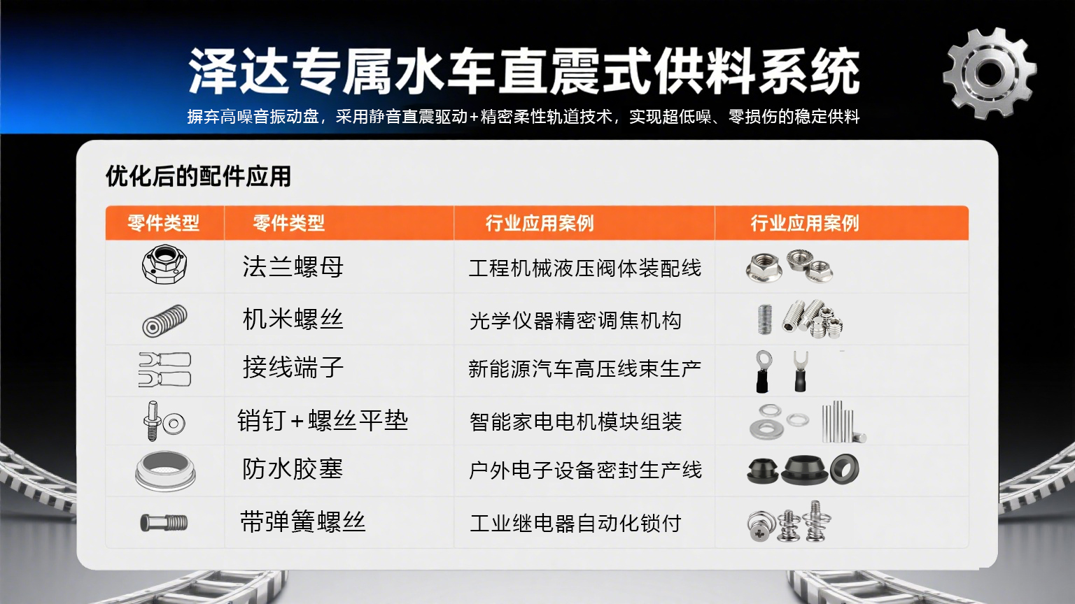 3.穩定適配: 針對法蘭麵、組(zǔ)合件(銷釘+平墊)、彈性件(膠塞、帶彈簧螺絲)等特殊結構,定製開發專屬輸送軌道,卡料率趨近於零。